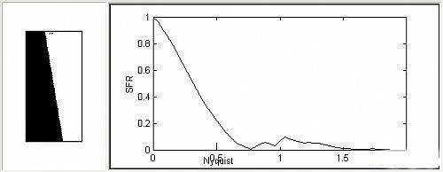 新名词 SFR!Spatial frequency response (SFR) 主要是用于测量随着空间频率的线条增加对单一影像的所造成影响。简言之SFR就是MFT的精简版。因为测量MFT需取得昂贵的正弦样版,并且需换算大量的数据。因此,PIMA开发了这款 较低成本的SFR作为替代品。基本上SFR只需一个双色调的黑白斜线(如下左图所示)即可换算出约略相等于MFT的值的解像力评鉴图。
